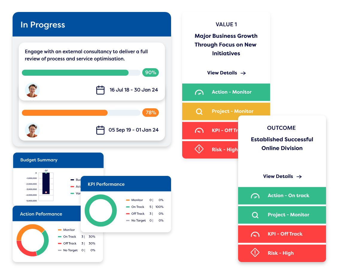 A comprehensive solution for strategic planning, execution, evaluation and reporting that allows individuals line of sight to see how every single action and task they do drives key organisational goals.