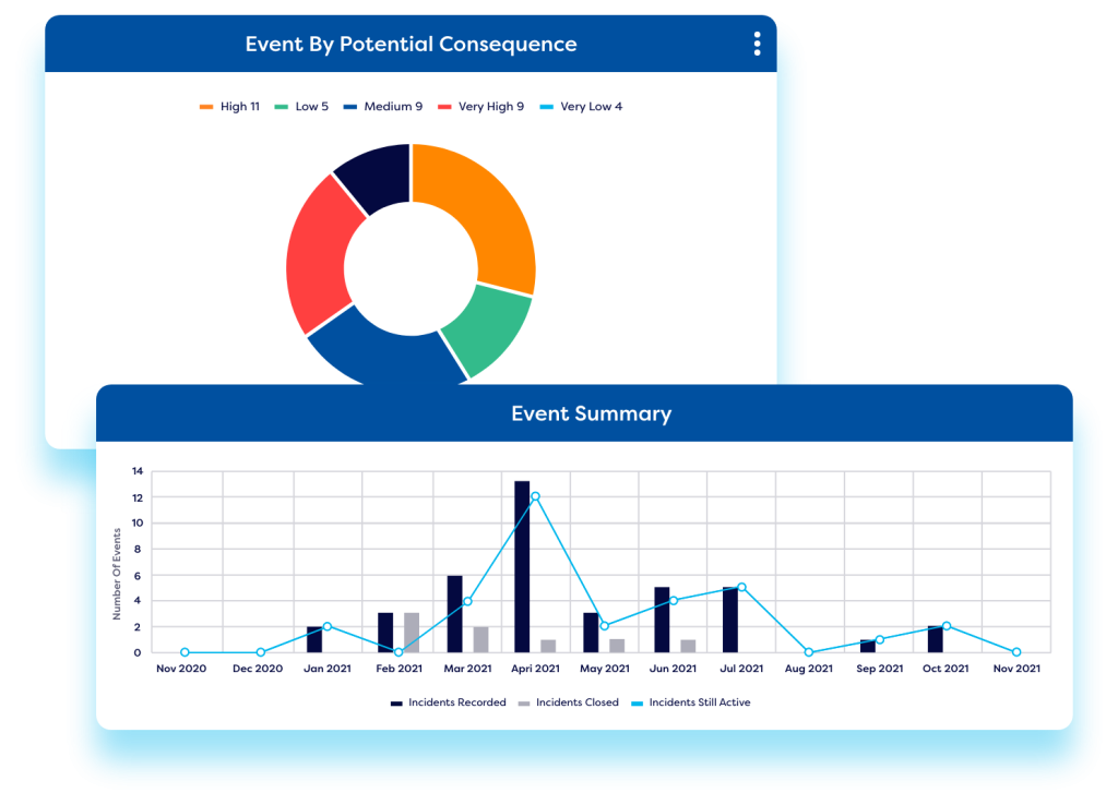Report incidents, near misses, and emerging risks – conduct investigations, determine impact, and monitor cases until closed. Spot trends and introduce controls to reduce reoccurrence.