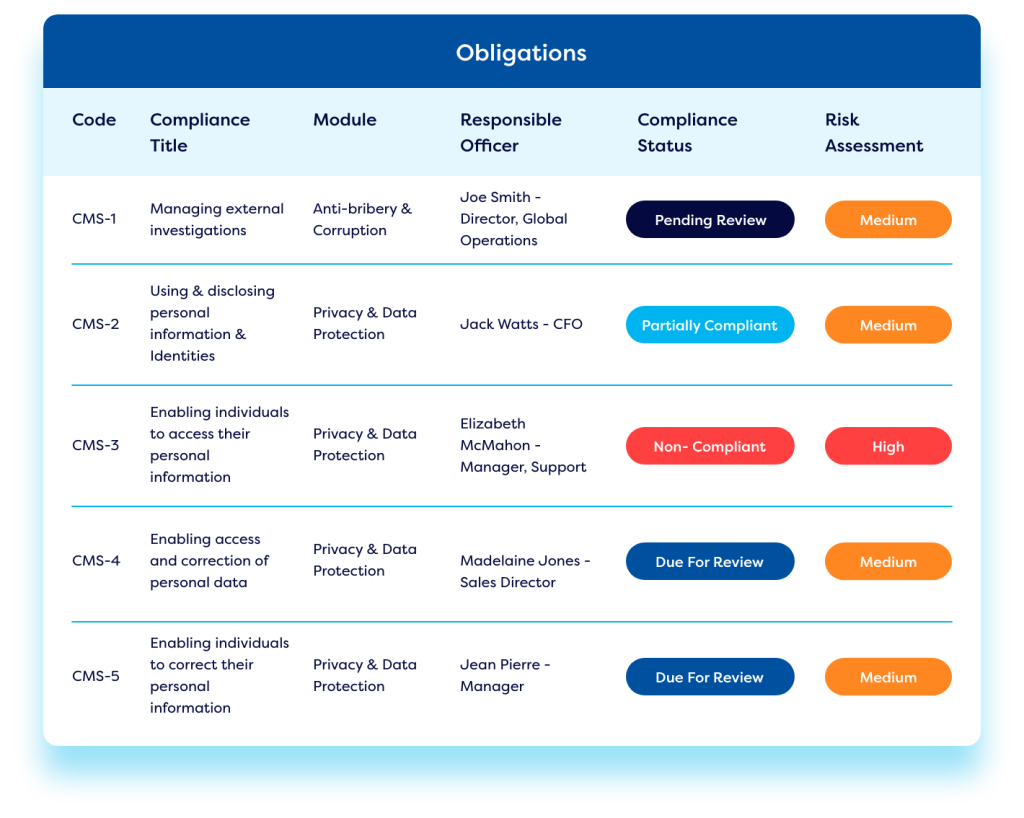 - Track progress against obligations and corrective actions.
