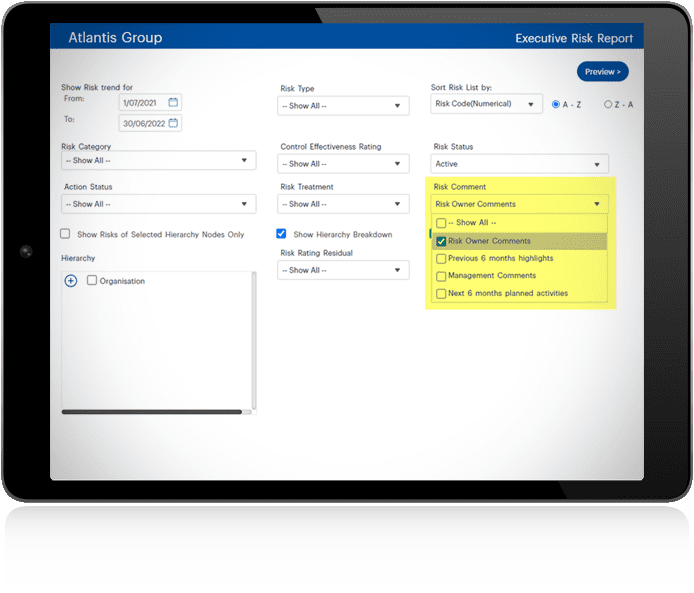 The Executive Risk Report has been enhanced to display all standard Risk Review Commentary fields within the Risk List section. This allows you to control the visibility of these Commentary fields via the new multi-select dropdown named ‘Risk Comment’ within the filter page.