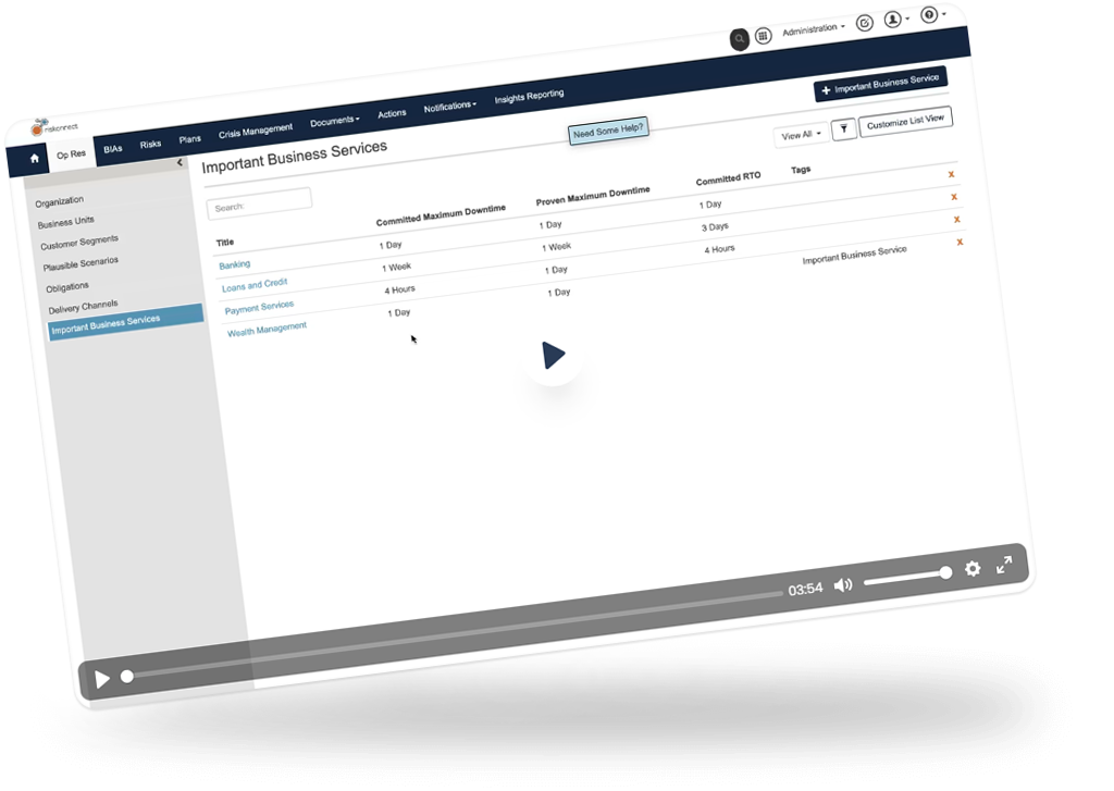 This interactive demo shows you exactly how our software simplifies the complexity of operational resilience. You’ll see how business impact analyses (BIAs) can be conducted easily by frontline teams, how automated workflows support faster updates to continuity plans, and how escalation protocols are triggered the moment risk thresholds are breached. You’ll also explore how external threat intelligence is integrated to proactively flag disruptions before they affect your business. The demo experience is tailored to your needs: choose what you want to see, skip what you don’t, and understand how the solution works in real-world scenarios.