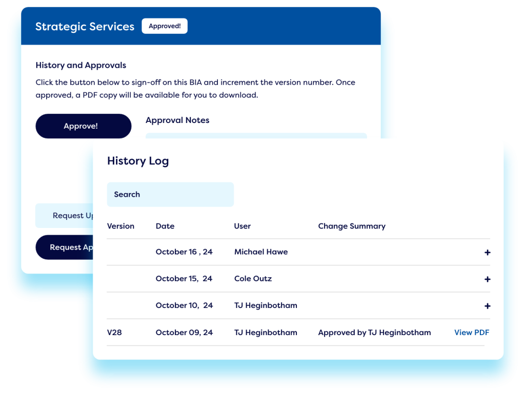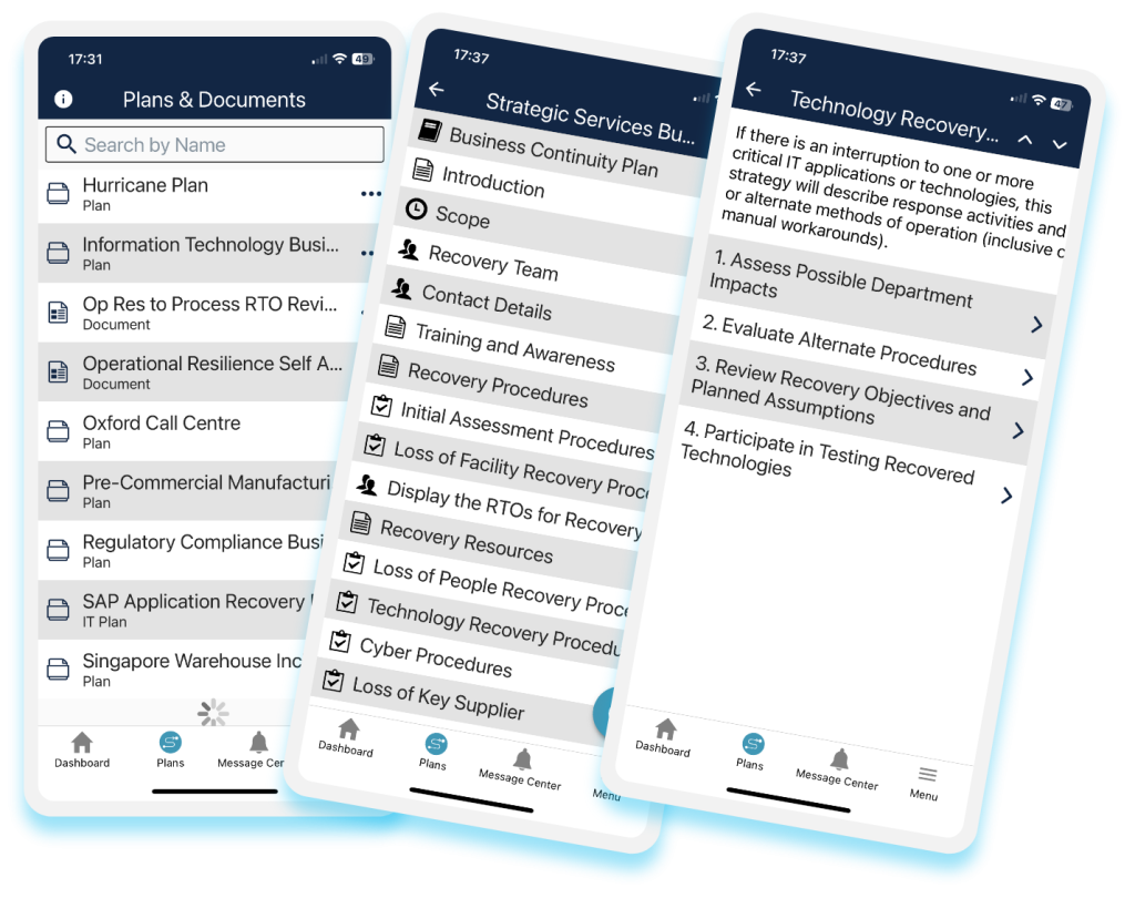Easily access business continuity program information and incident management status on-the-go using our mobile app. Staff can check plans, complete BIAs and risk assessments, anytime, anywhere. Teams can enter data without the internet, and the information will be uploaded into the system when a connection is restored.