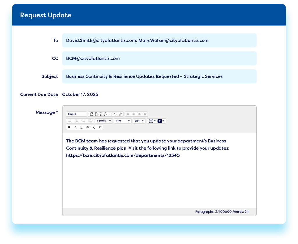 Enable department owners to easily update BCM plans with minimal training. Develop meaningful scorecards, dashboards, and reports for leaders that summarise key performance and risk indicators.
