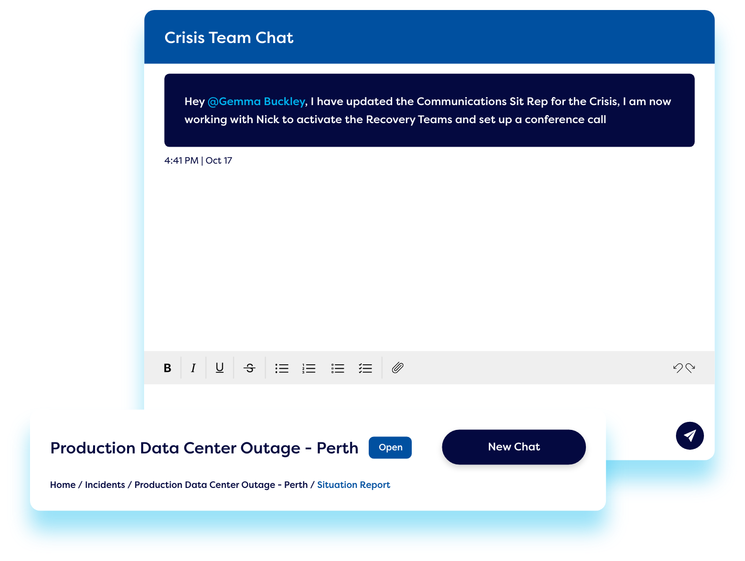Some crises may affect communication channels. Our crisis and incident management software offers an encrypted chat solution so you can securely collaborate with your team – even when communication channels are down, or systems are compromised. Communicate securely under any conditions with one-on-one chats, group chats, tagging, and file sharing capabilities.