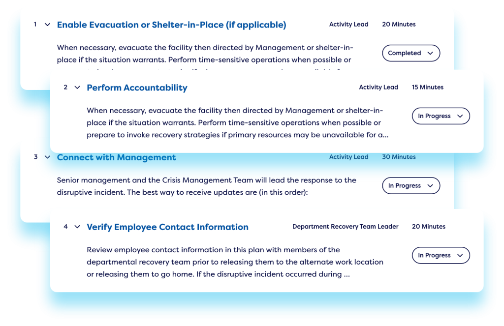 Our crisis management software allows you to quickly transform plans into actionable checklists, coordinate your response plans, and align stakeholders effectively in a crisis.