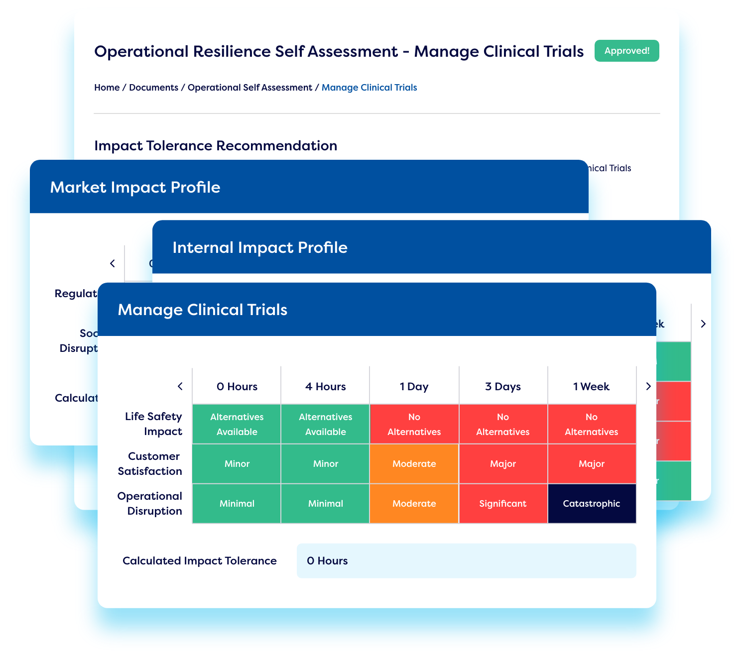 What would happen to your customers, your operations, and the market if your services were disrupted? Our operational resilience software digitally illustrates the impact of a disruption and the associated obligations by mapping scenarios to different customer segments. Use ‘what if’ modelling to understand the impact of downtime on operations and service levels with visual impact profiles that scale from minor to catastrophic. This enables firms to quickly pinpoint and resolve potential gaps in their disruption tolerance by viewing products & services based on committed, proven, and lowest calculated impact tolerances.