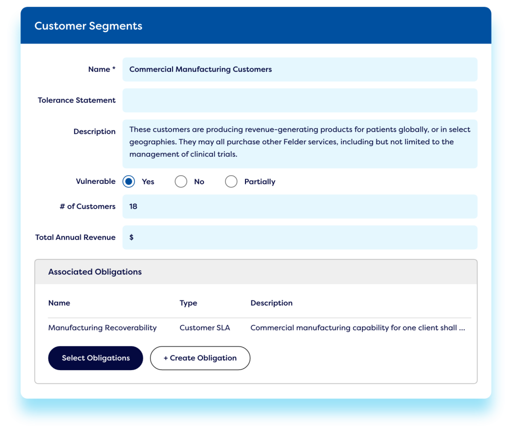 Address gaps in your ability to tolerate disruptions by mapping customer segments to specific obligations, delivery channels, and products & services to understand the impact.
