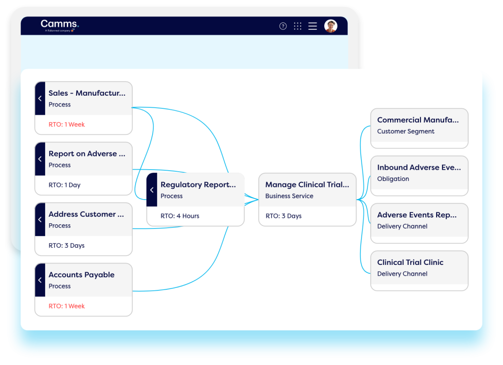 Many firms – particularly those in financial services & critical infrastructure – are required to have operational resilience measures in place to comply with certain regulations and demonstrate compliance. The Camms operational resilience solution enables firms to implement process that align with key operational resilience regulatory requirements including those outlined by The Bank of England, Basel, DORA, OCC, FFIEC, APRA and the requirements of ISO 22301.