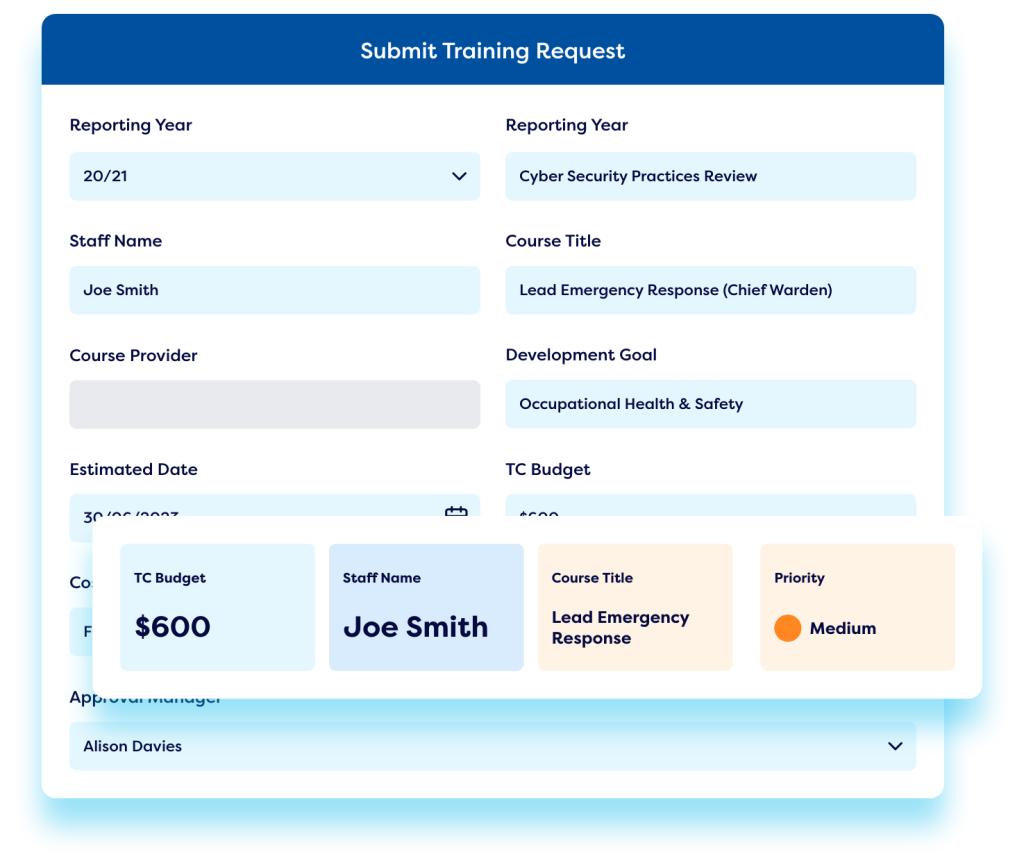 Allow employees to submit requests for training that they would like to participate in, with the option for their managers to review and approve. This works with automatic integration to their individual assessment so there’s a record of all trainings at the end of the assessment period.
