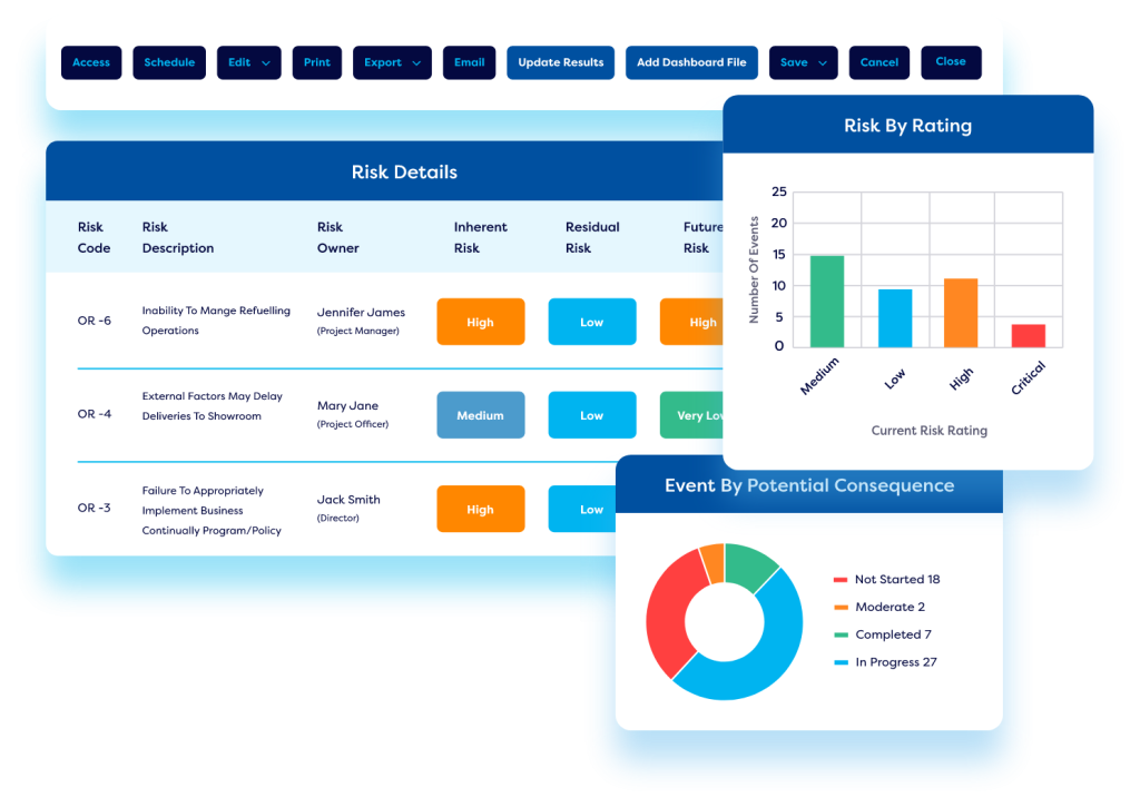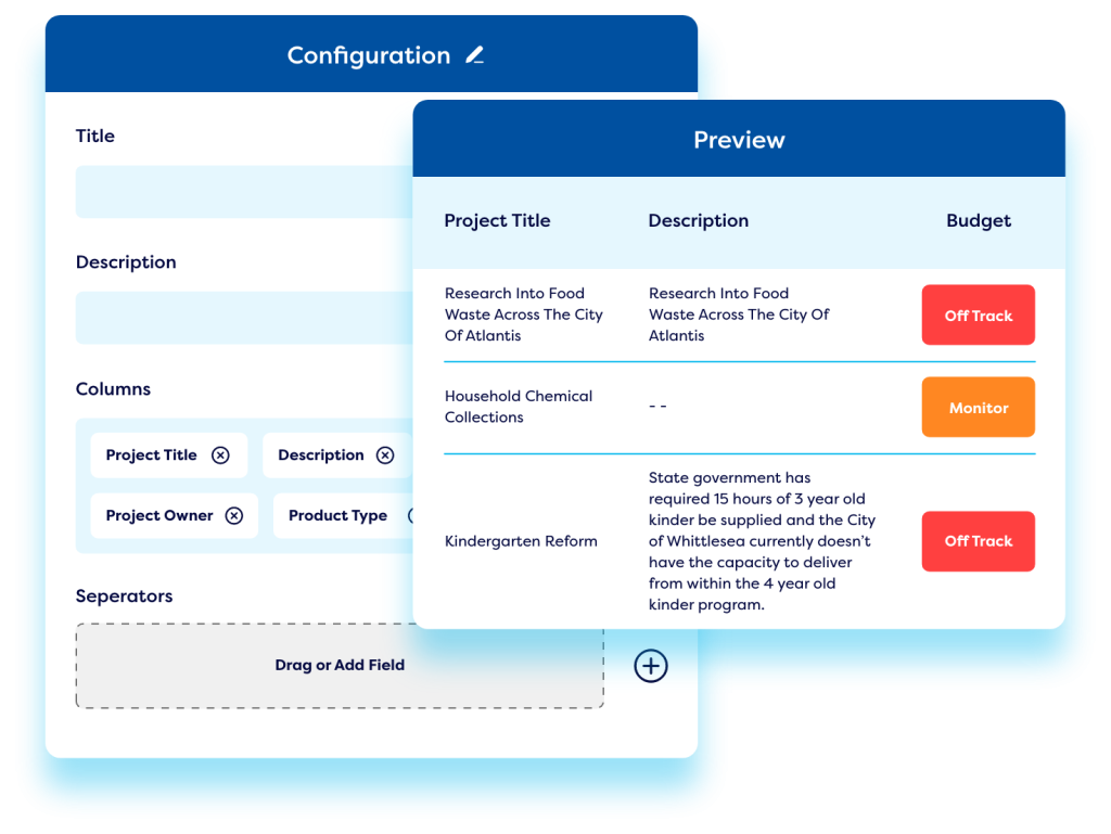 Leverage a wide range of inbuilt datasets to draw data from any Camms solution, and create your reports using a visual interface with no coding necessary. Select from a range of widgets and built-in formatting options to easily customise them.