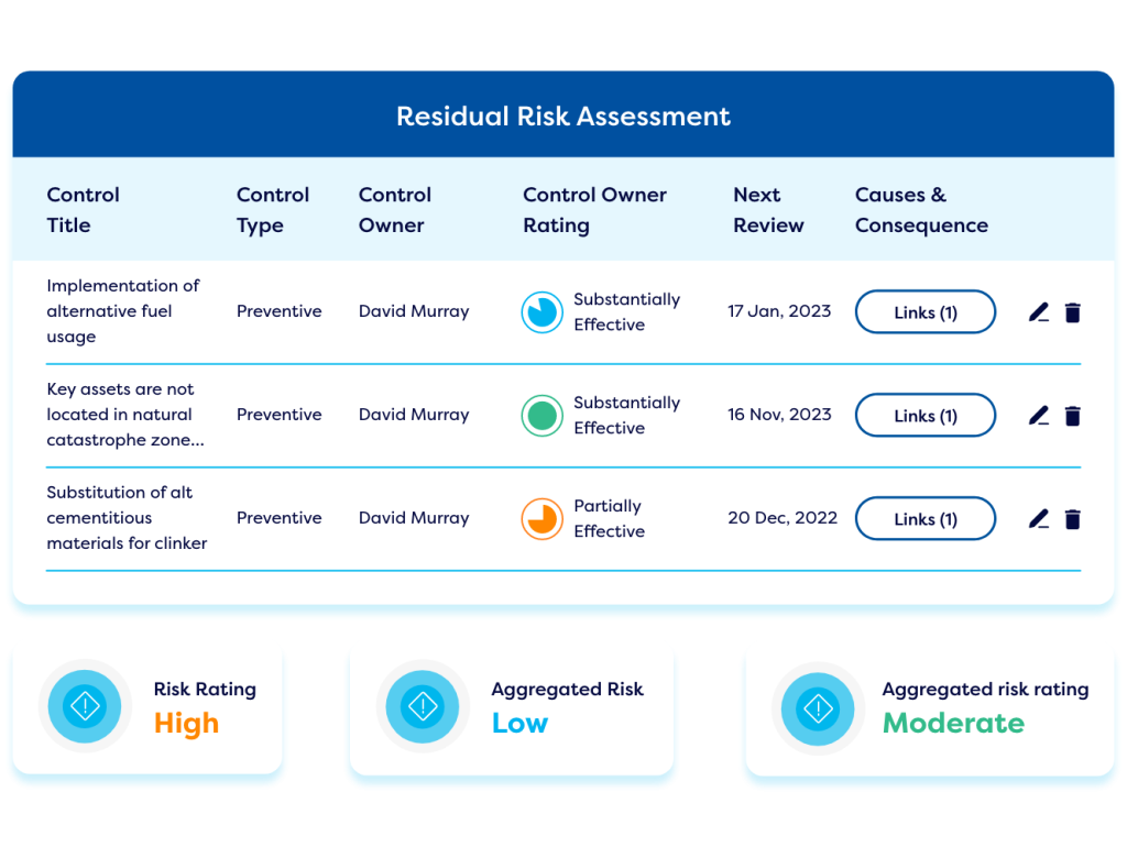 Most risk management dashboards will contain data regarding control effectiveness & control checks. Operational staff will get a simple view of any control checks and testing tasks that are pending. Management will get an overview of control effectiveness and control status across their departments & teams, and risk professionals will get a holistic view of control effectiveness across the entire enterprise enabling them to suggest improvements in problem areas.